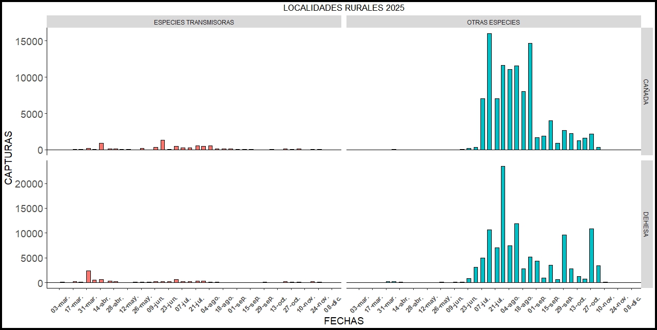 Capturas de mosquitos en las localidades rurales de LA CAÑADA DE LOS PÁJAROS y DEHESA DE ABAJO, en función de su capacidad transmisora del Virus del Nilo Ocidental 2026.
